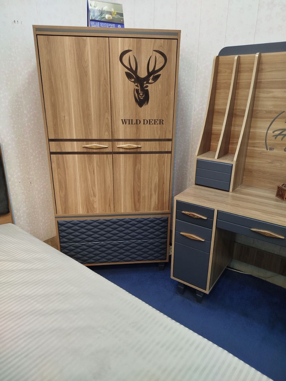 اقلام سرویس: تخت 200×90 به همراه سه کشو ریلی ، دراور آینه، میز تحریر، کمد دو درب (عرض 90)، پاتختی دو کشو